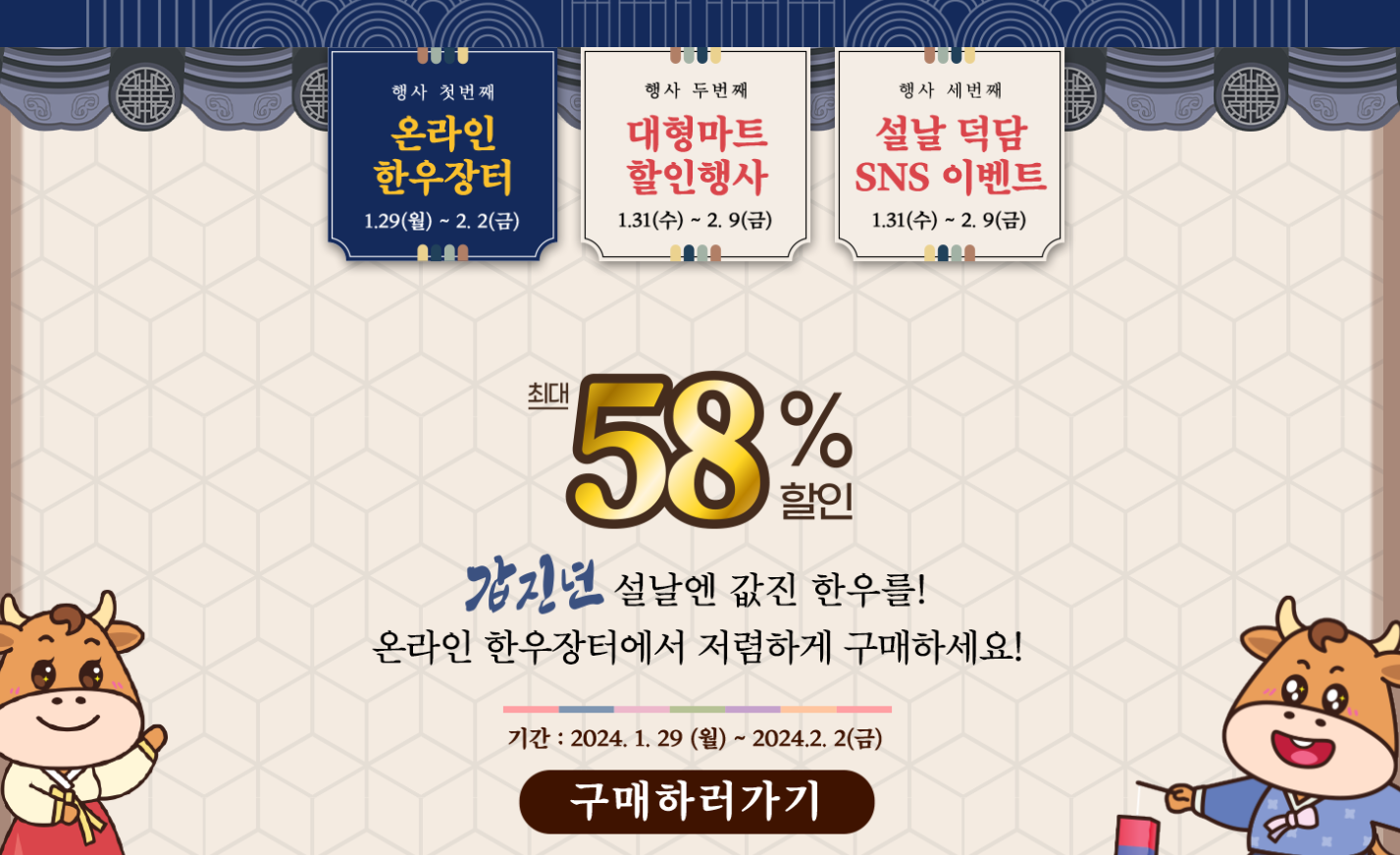 세부 할인 행사일정은 주요 대형마트 및 슈퍼마켓의 경우 오는 31일부터 실시되며 한우자조금, 전국한우협회 누리집에서 확인 가능하세요. 이번 설 명절은 한우를 합리적인 가격에 부담없이 구입하여 기쁨이 두배가 되는 설이 되었으면 합니다.